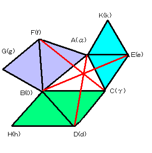 定理4 △ABCの辺BC,CA,ABを1辺として正3角形CBD,ACE,BAFを△ABCの外側に作ると、次のことが成り立つ。