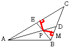 PからBC、ACに下した垂線の足を、それぞれ、M、Nとする。 Pは△ABCの角の2等分線の交点(内心)だから、PM=PN。 これと、仮定のPD=PEから、2つの直角三角形PMDとPNEは合同となり、 ∠PDM=∠PEN ・・・@ が得られる。 ここで、MとNの位置関係について、次の場合が考えられる。 場合T:M、Nとも四角形CEPDの辺上にないとき。 場合U:M、Nとも四角形CEPDの辺上にあるとき。 場合V:M、Nの一方のみが四角形CEPDの辺上にあるとき。 場合Tのとき、∠PDM=180゜−(α+2β)かつ∠PEN=180゜−(2α+β)。 ここで、@ より、α=β、つまり、∠A=∠B となる。 場合Uのとき、 ∠PDM=α+2β かつ ∠PEN=2α+β ここで、@ より、α=β、つまり、∠A=∠B となる。 場合Vのとき、Mが四角形CEPDの辺上になく、Nが四角形CEPDの辺上にあるとする ∠PDM=180゜−(α+2β)かつ ∠PEN=2α+β ここで、@ より、α+β=60゜ したがって、∠ACB=180゜−(2α+2β)=60゜ また、∠ACB=60゜であれば、△PMD≡△PNE となり、 PD=PEとなっていることもわかる。つまり、∠A=∠Bとは限らない例が無数にある。 次に、場合Vで、Mが四角形CEPDの辺上にあり、Nが四角形CEPDの辺上にないと するときもまったくの同様である。 以上によって、PD=PEとすると、 ∠A=∠Bとなるか、あるいは、∠C=60゜となる場合がある。 証明終 |
