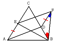 今、AD=BEかつ∠A<∠B仮定すると、AE>BDとなり、 DF>BDを得る。 つまり、∠DBF>∠DFBと分かる。・・・@ ところで、∠DFE=∠EAD<∠DBE・・・A したがって、∠EBF=∠DBE+∠DBF >∠DFE+∠DFB=∠BFE (@とAから) となる。 これは、三角形BFEにおいて、BE=AD=EF に矛盾。 同様に、AD=BEかつ∠A>∠B仮定しても矛盾がでる。 以上から、「AD=BEならば∠A=∠B」が成り立つ。 証明終 |