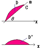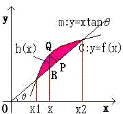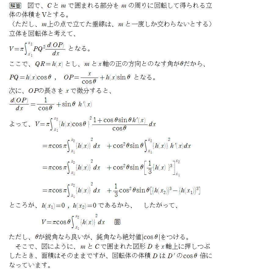 問題 曲線C:y=f(x)と直線m:xtanθで囲まれた下の図形を、直線mを軸として回転して得られる立体の体積を求めよ。