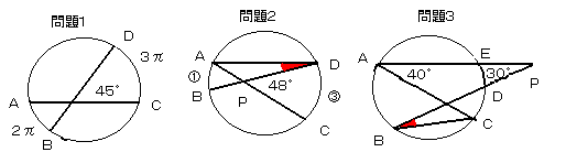 問題3 図のような円があって、∠CAE=40゜,∠APD=30゜で、弧ABの長さと弧CEの長さの
