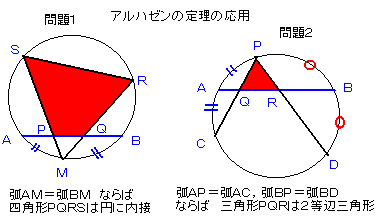 「アルハゼンの定理」の応用問題です。問題1:参考図1を見てください。弧AMの長さと弧BMの長さが等しいとき、