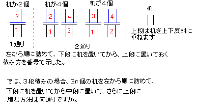 問題1:この机の積み方は一体何通りあるでしょう。机が2個、4個、6個、・・・と考えて,下の参考図をみて実際に積んでみてください。