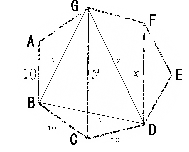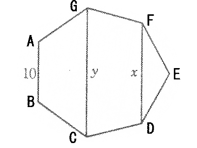 一辺の長さが10cmの正七角形ABCDEFGがあります。図の中にある2つの対角線DFとCGの長さをxcm、ycmとするとき、
