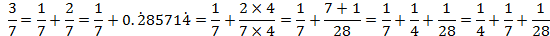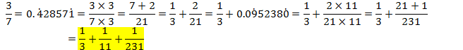 (1) 3/7 = 1/3 + 2/21 = 1/3 + 1/11 + 1/231