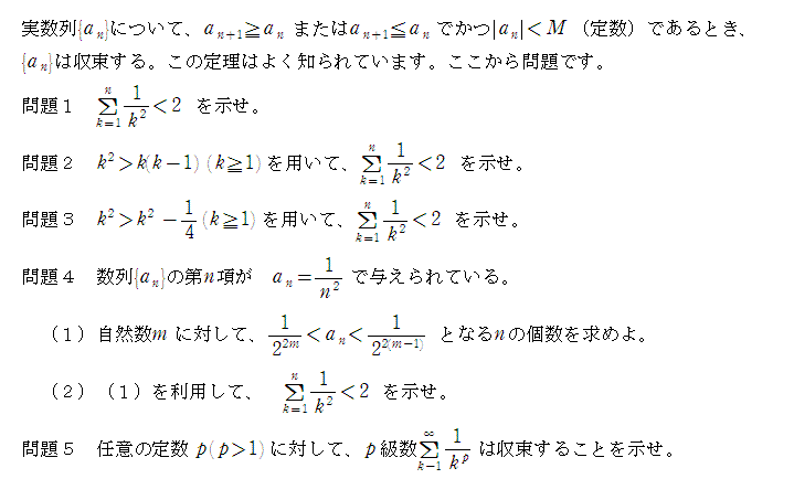 Σ(k=1から∞)1/k2 =π2/6=1.64493・・・となることは知られています。下記のような“和の有界性”を証明する問題は高校生でも解ける範囲です。