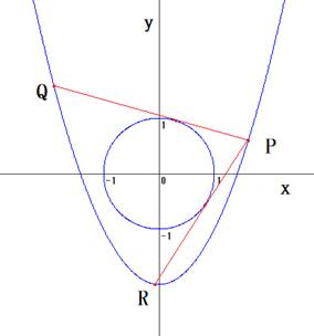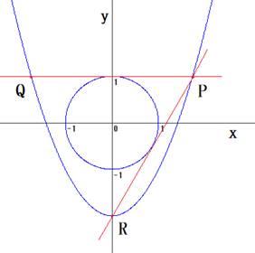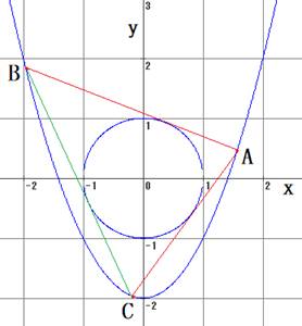問題1 原点を中心とする半径1の円をSとする。放物線y=x2−2上に相異なる3点A,B,Cがあって、直線AB,直線ACがSに接しているとき、直線BCもまたSに接することを証明せよ。