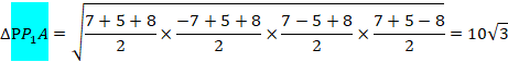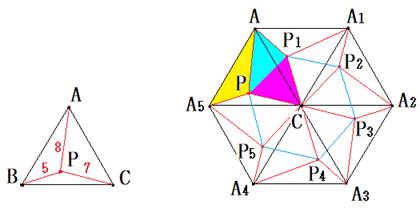問題2 正三角形ABCの内部の点Pについて、PA=8、PB=5,PC=7とする。このとき正三角形の一辺の長さを求めよ。