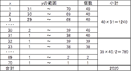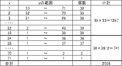 32≦x+y≦71 に当てはまる数を地道に数えます。