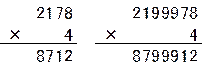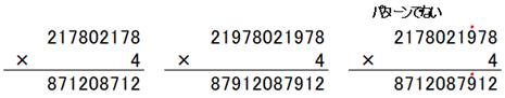 この結果より,4桁の数2178,8桁の数21782178が,この性質を有し,21999978もこの性質を有することが分かる.
