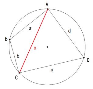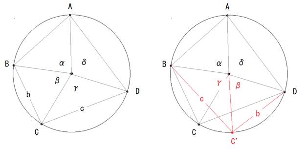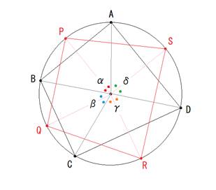 円に内接する四角形と弧の中点を頂点とする四角形の面積比の問題です。図はここをクリックください。