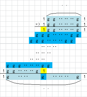 いままで見てきたように、2進法の分数にしたとき、水色の部分の分母は、
