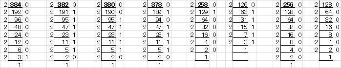 382は1個、380は2個、378は1個それぞれ2を因数にもちます。