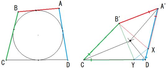 交点からA'B'まで、ADまで、CDまで、CB'までの距離が等しくなります。