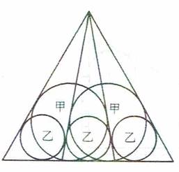 正三角形内に等しい2斜線を作り、甲乙5個の円を入れる(甲円は三角形の1辺と斜線に接し、乙円はそれぞれの小三角形に内接している)。甲径を知って乙径を求めよ。