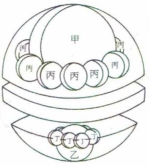 球を上中下の三段に切り、その上段に甲球を、下段に乙球を入れる。甲乙球はその段矢が等しい。そして上下段に等球を以って甲、乙球をそれぞれ囲む(等球は互いに外接している)。外球径、