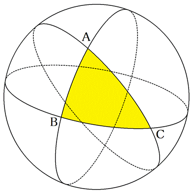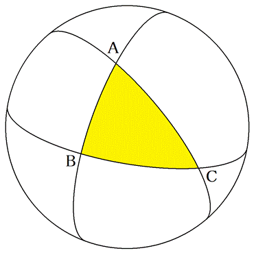 半径rの球面上に△ABC(球面三角形)があり、その3つの内角をそれぞれA,B,Cとする。次の設問のとき、図のような△ABCの面積を求めよ。
