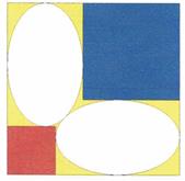 正方形の内へ、青、赤2個の正方形を青は右上に、赤は左下に接するように入れる。その隙間に2個の等楕円を正方形に接するように入れる。青と赤の一辺を知って楕円の面積を求めよ。