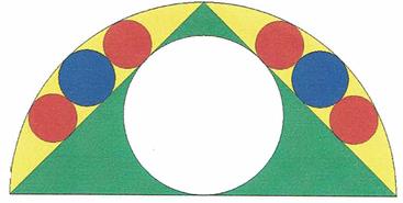 半円内に直角二等辺三角形をつくり、その隙間に青、赤の6個の円を入れる(各円は互いに外接して三角形の辺と半円周に接する)。半円の直径を知って赤円径を求めよ。