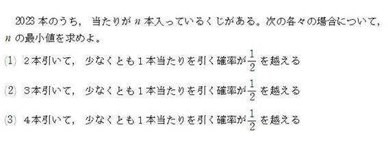 である確率は,1-(2023-n)*(2022-n)*(2021-n)*(2020-n)/(2023*2022*2021*2020).