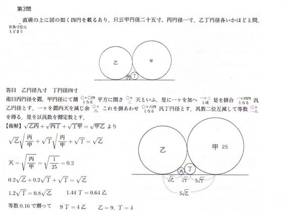 直線の上に図の如く四円を載せる 只云 甲円径二十五寸 丙円径一寸