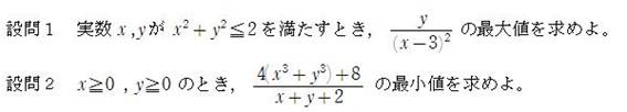 以上より,(与式)の最小値は 3. (x=y=1/2のときに実現する)