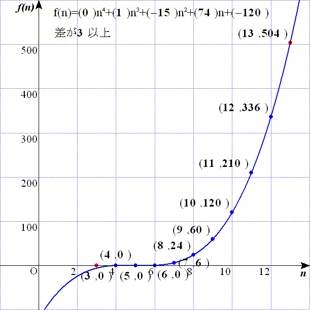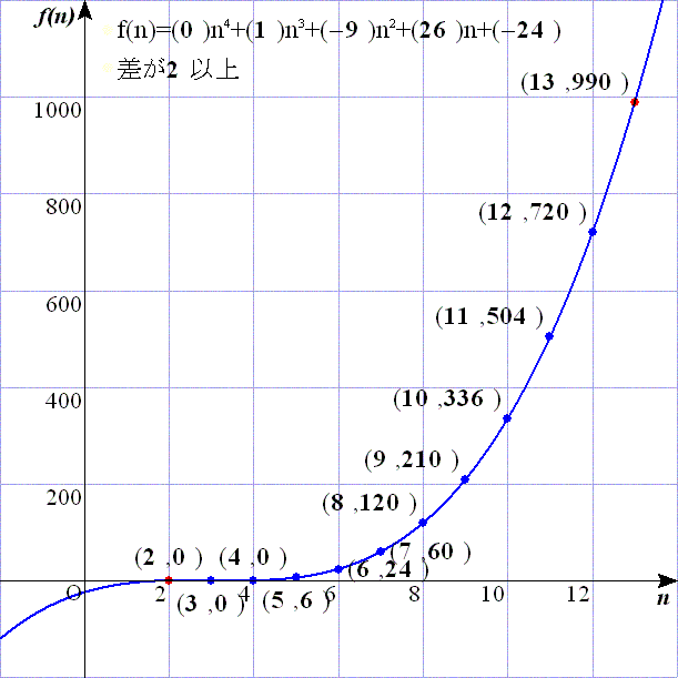 g(n)=n4−42n3+659n2−4578n+11880=(n−9)(n−10)(n−11)(n−12)(差が4以上,n≧9)