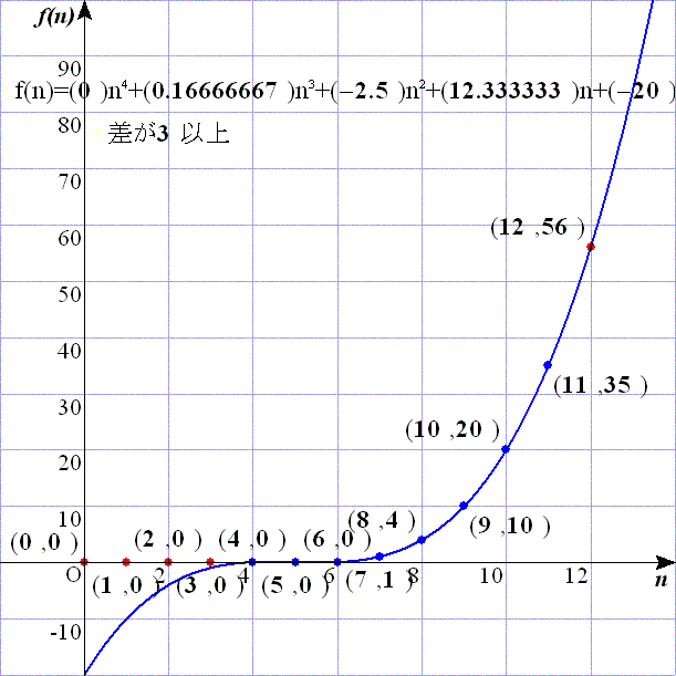 となるので,f(n)=n3/6−7n2/2+73n/3−56=(n−6)(n−7)(n−8)/6=n−6C3=n−8H3(n≧6)となる.