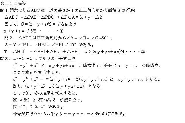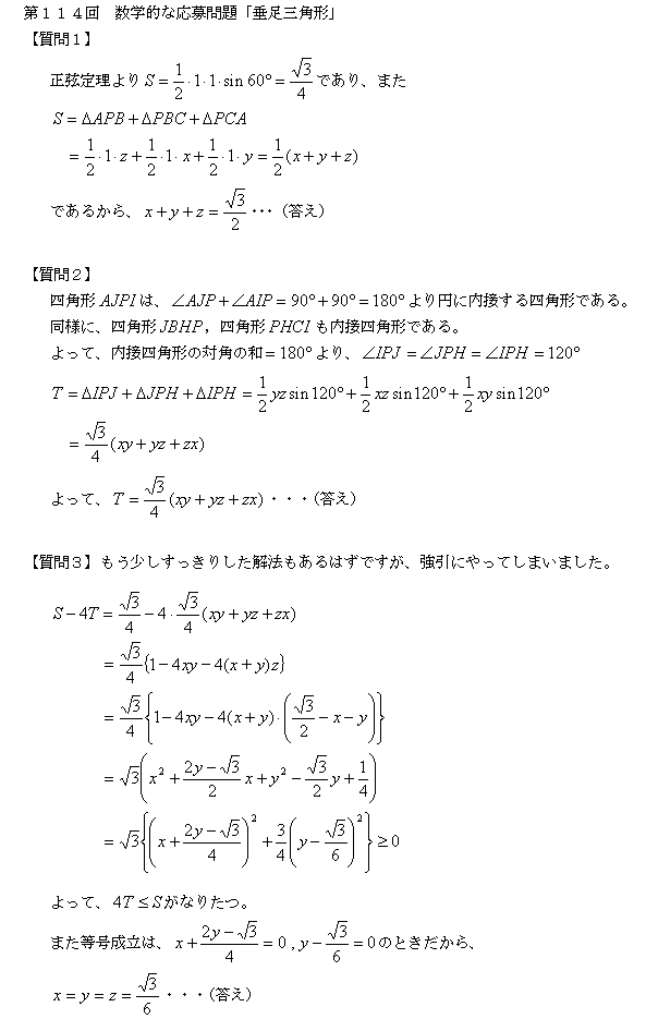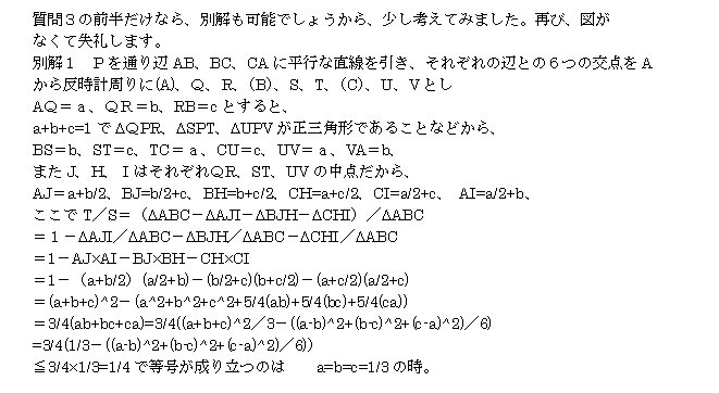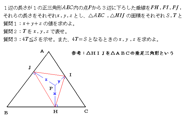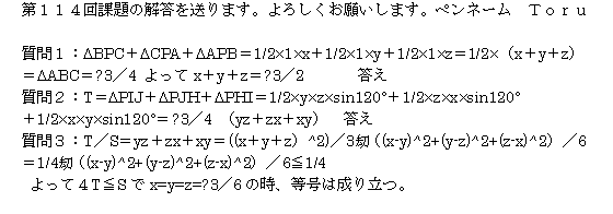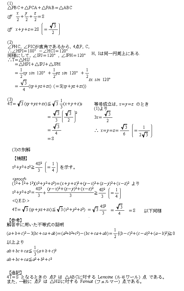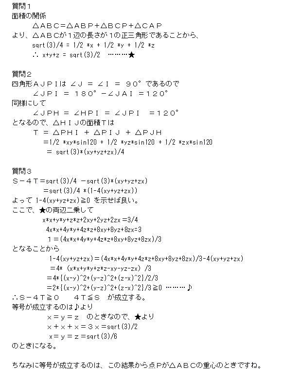 このとき(*)は1/4をとる.よって,T=sqr(3)/4*(xy+yz+zx)<=1/4*sqr(3)/4=1/4*S,