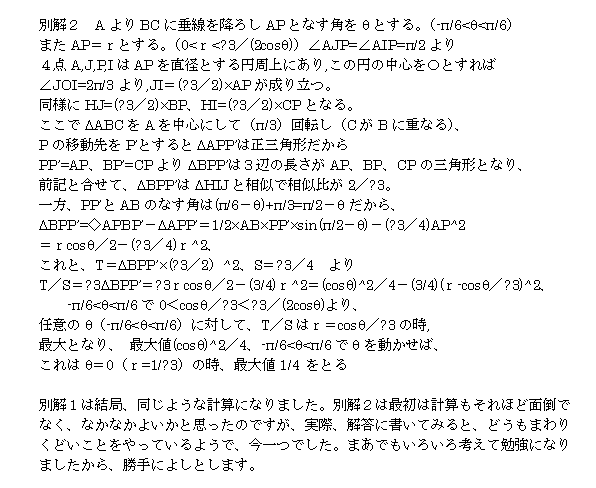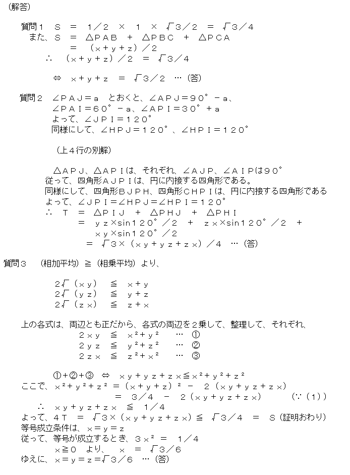 よって,(*)が最大値をとるのはx=x/4+sqr(3)/8,y=y/4+sqr(3)/8,即ちx=y=z=sqr(3)/6のときで,
