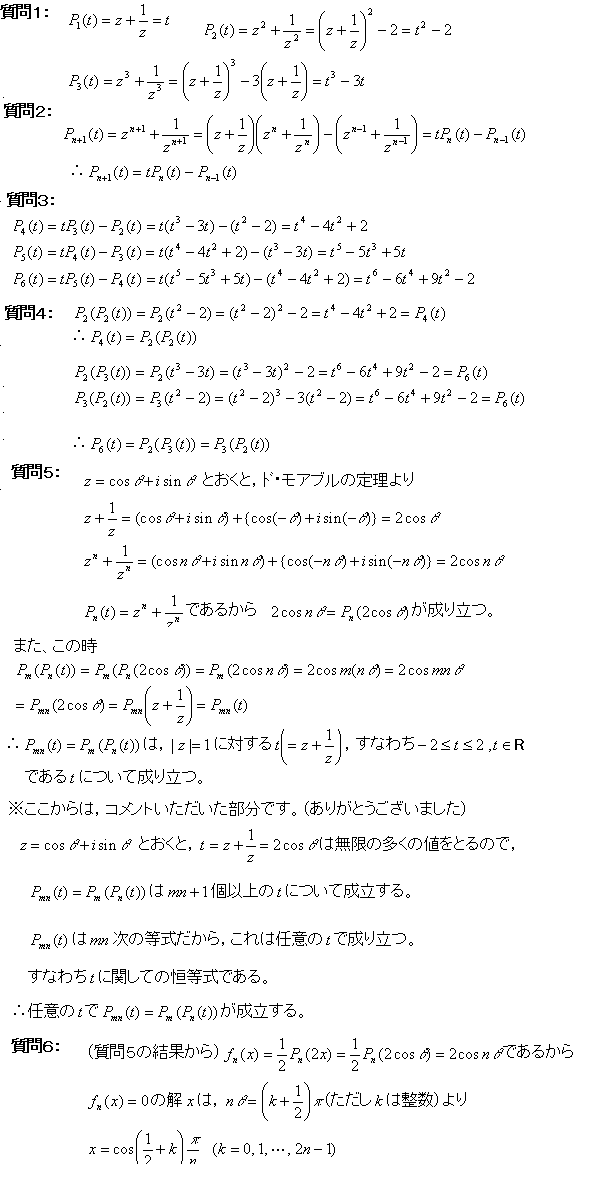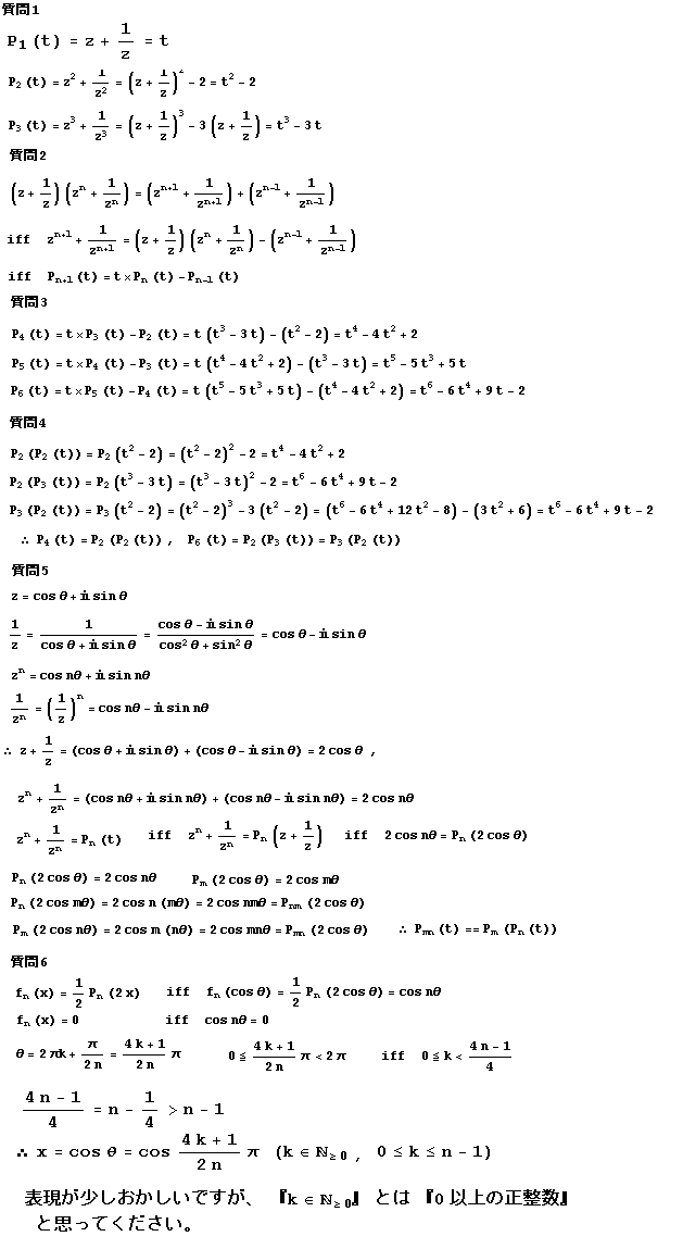 質問1 (z+1/z)^2=z^2+(1/z)^2+2 よりP2(t)=t^2-2 ,
