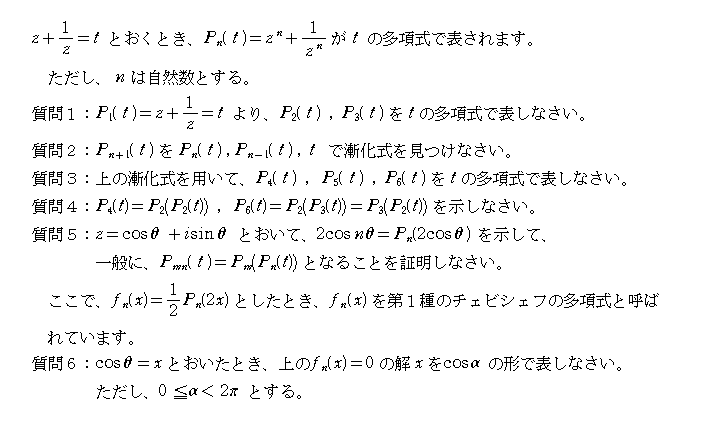 質問5 z=cosθ+isinθとすると1/z=cosθ-isinθよりt=z+1/z=2cosθ