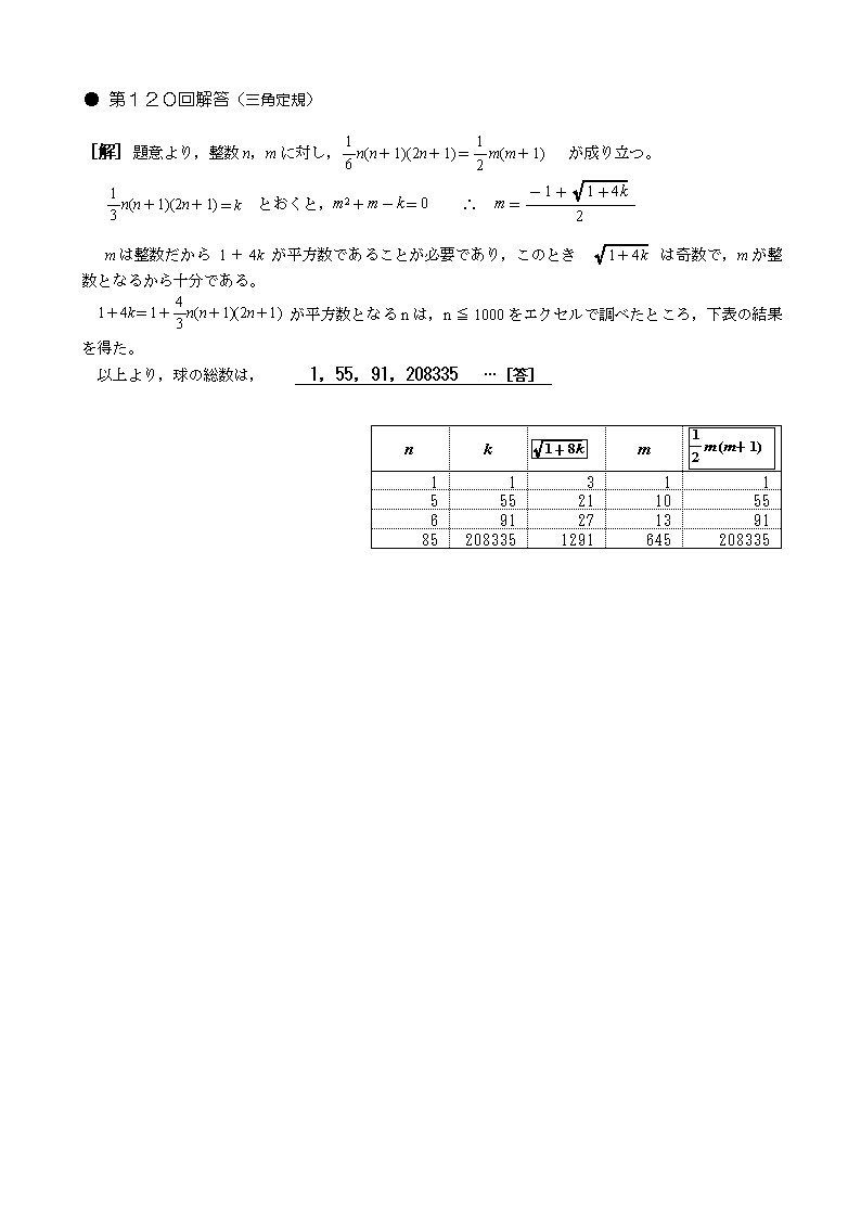 "ピラミッド型に積んだ球の個数が三角数になる場合を求めよ。"
