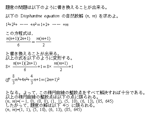 前回の解答を参考にすると、m(m+1)(2m+1)/6= n(n+1)/2 の正整数解をもとめればよい。