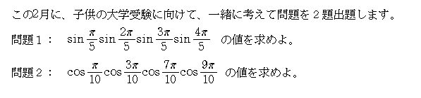 今回は、1の5乗根や10乗根に関係の深い3角関数の積の問題です。
