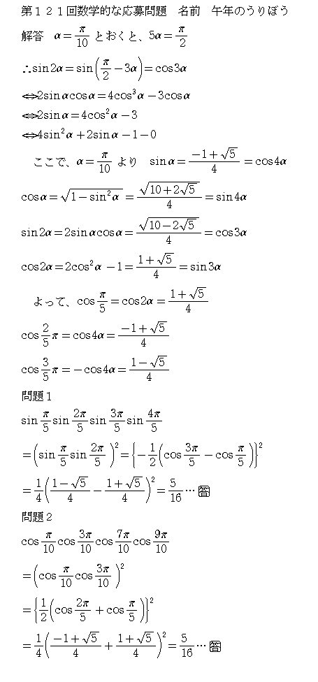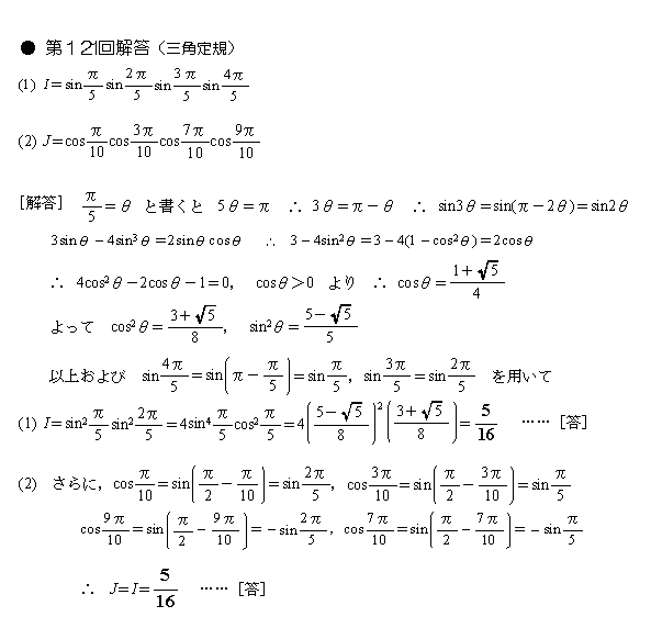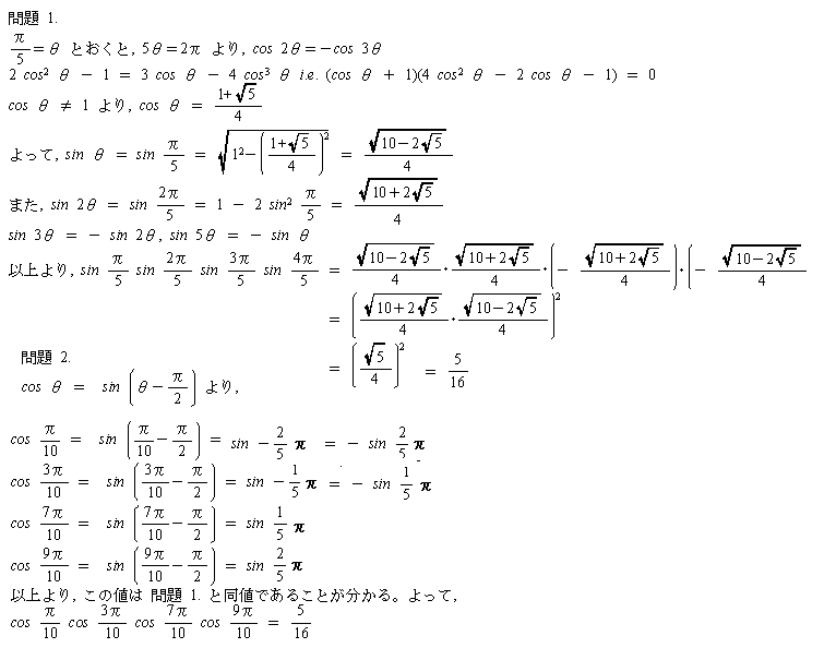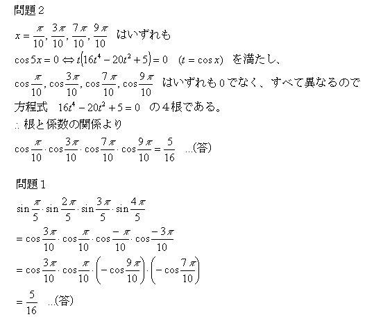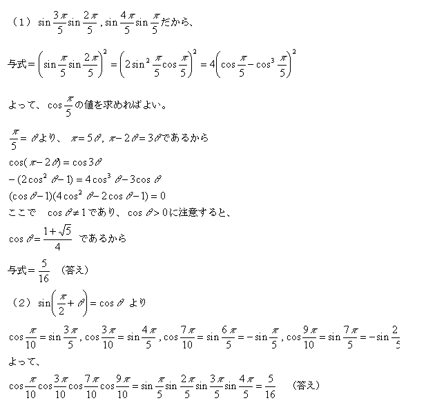 π/10=sinπ/5 sin2π/5 sin3π/5 sin4π/5=5/16――――答え