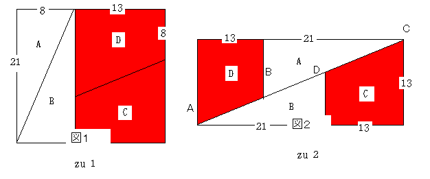 zu2の三角形Bの傾きを計算すると8/21である。又、台形Cの傾きは(13-8)/13=5/13であり、5/13>8/21である。もし、zu2の様な図形が描けるとすると、当然傾きは等しくなければならない。ところが等しくない、即ち、本当は台形Cが三角形Aと重なっており、面積は21×21である。