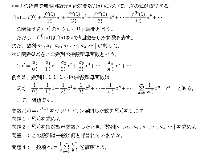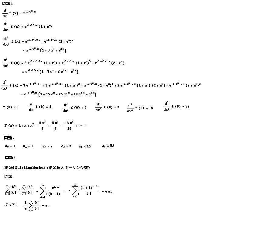 ば、a(n)=f(n)(0)=1/eΣk^n/k! (k=1〜∞) が得られる。(k=0の時はk^n=0で同じ)