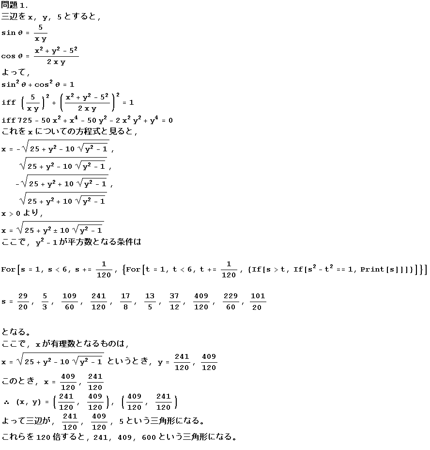 第1問の三角形の1つ・・・辺の長さ600、241、409