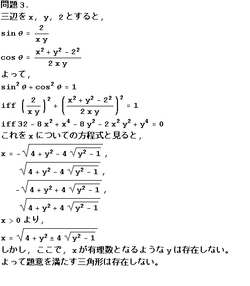 問題3:3辺の長さa,b,cが全て整数である三角形で、底辺aが高さhの2倍に等しいものは存在しないことを証明しなさい。