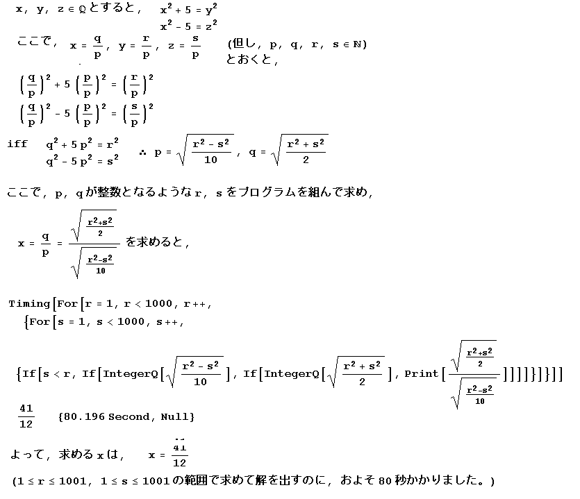 <解答>題意の数をuとしますと、平方に5を加えても、平方から5を引いても完全平方となるわけですから、