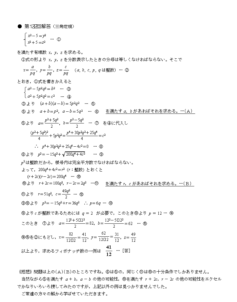 <コメント>第132回(フィボナッチ数)解答送ります。