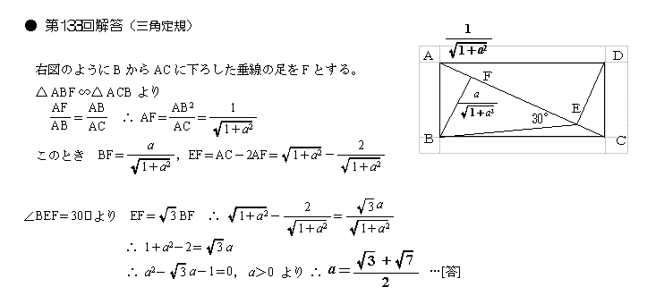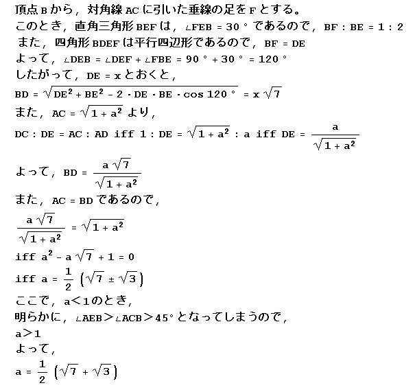 受信 更新2/21 題意より△ACD∽△ADE∽△DCE 因って、AE=a2/√a2+1、CE=1/√a2+1即ち長さの比はa2:1である。 ここでBE=Xとおき、△ABEの面積をSとすると、△ABCの面積のa2/a2+1であるから、S=a3/2(a2+1)となる。 因って、S=a3/2(a2+1)=Xa2/4(√a2+1) 即ち、2a/√a2+1となる。 ここで、△ABEに余弦定理を適用し、整理すると a4−2√3 a3+3a2−1 =0 この式を因数分解すると、 (a2−√3 a+1)(a2−√3 a−1)=0 ここでa2−√3 a+1>0であるから、 a2−√3 a−1=0を解けばよい。この方程式を解いて、二つの値を得るが、aは正であるから、 a =(√7+√3)/2が求めるものである。 NO4「UnderBird」2/02: 14時25分