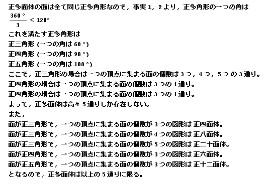 即ち、正多面体を形成する正多角形は5角形までで、6角形以上では正多面体を形成できないことが証明された。