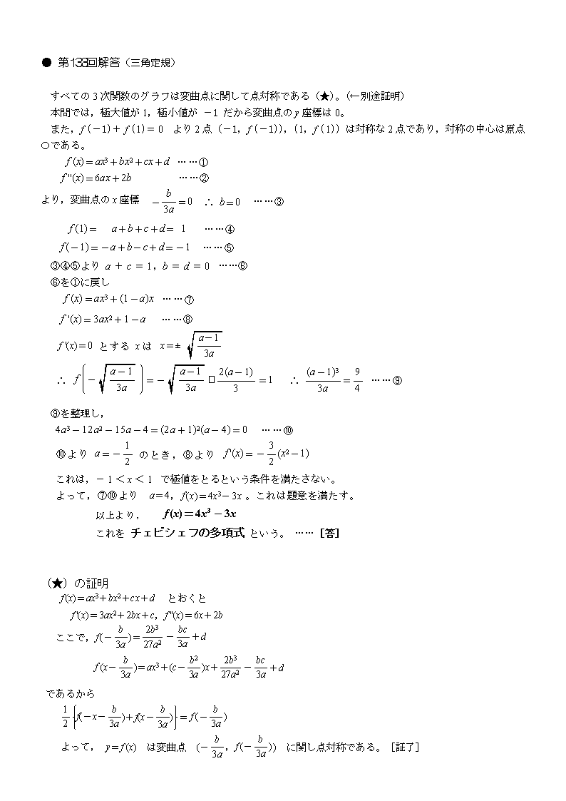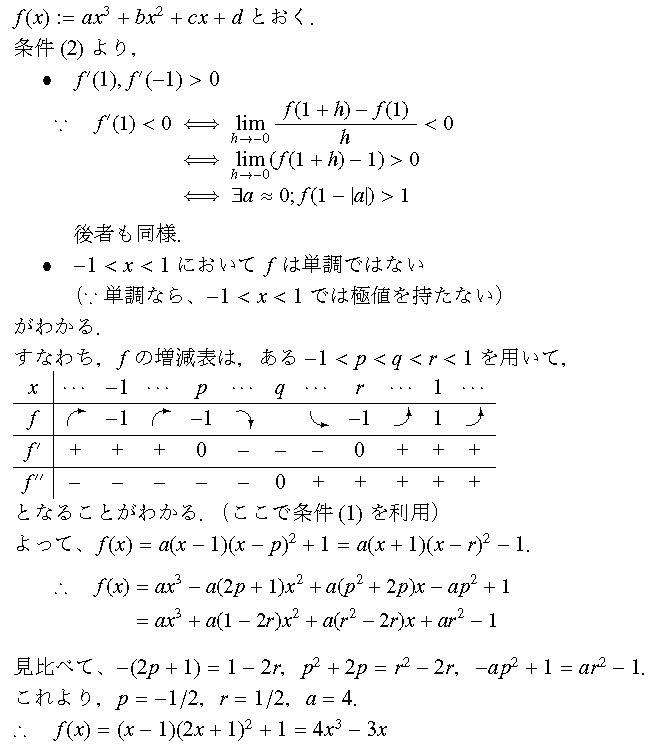 これはaが正という条件を満足する。 以上より求めるものは、f(x)=4x3−3xとなる。