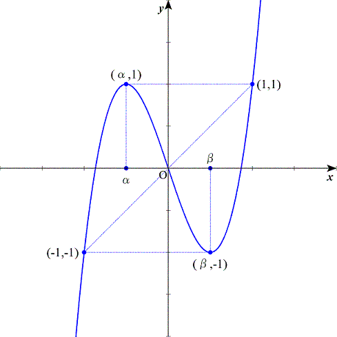 題意により、極大値f(α)=1・極小値f(β)=-1が存在して(α<β)、f(-1)=-1、f(1)=1なので、