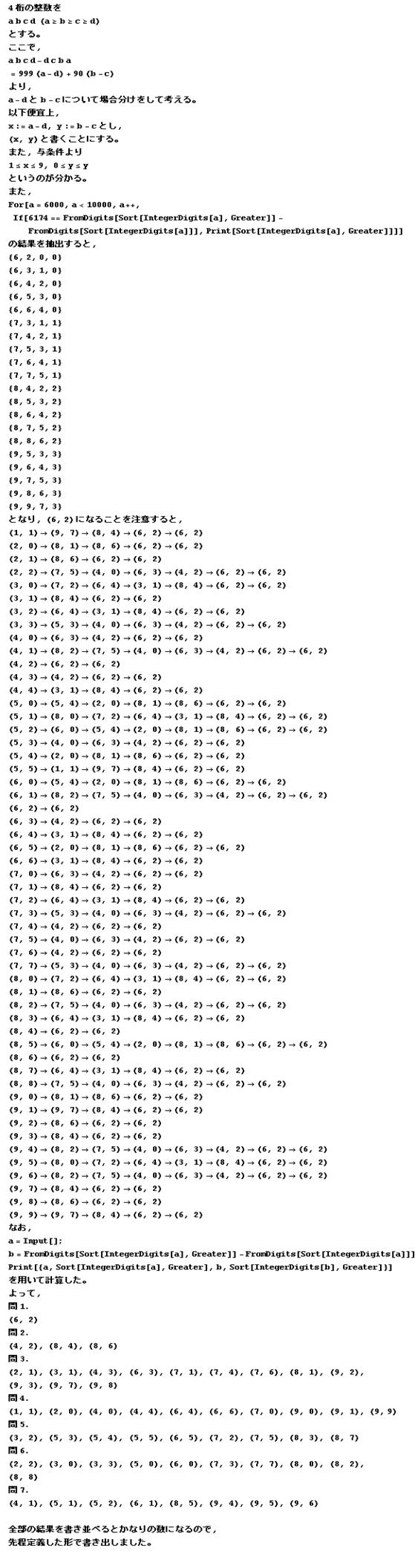 【その2】『4桁の自然数(全数字が等しい数を除く)をaとし…』とありましたが, 除くのは 9 つだけではなく, これらを含めて 77 個あります。