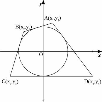 四角形を適当に拡大縮小して、内接円を単位円とし、その中心を原点Oとして四角形と円との接点をAD上のものから、