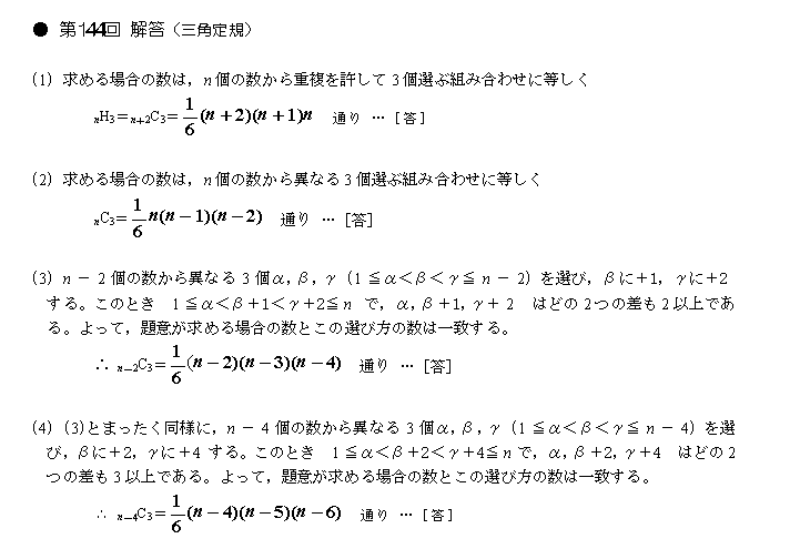 問題4 1?n-4)の(n-4)から3個を選びa<b<cとして、これにa,b+2,c+4を対応させれば題意の組み合わせと1:1の対応となるから