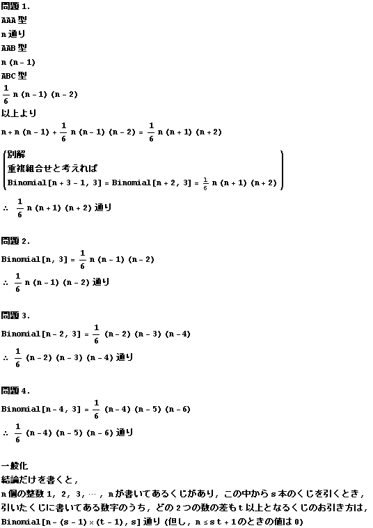 (5.)以下同様に,どの2つの数の差もm以上になる場合は(n-2m+2)(n-2m+1)(n-2m)/6通りになると推測できる.証明は帰納法による.